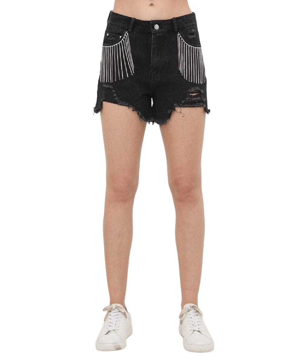 85% Cotton/15% Polyester; Five Pocket Styling; Distressed Design; Frayed Hem; Fringe Rhinestone Front Pocket Accent; Style #27368P-O
