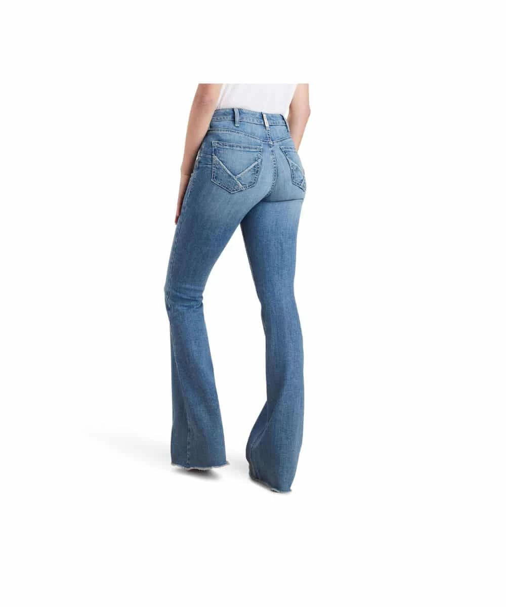 82% Cotton/ 17% Repreve Recycled Polyester/ 1% Spandex; Color: Oakland; Light Wash; High Rise; Flare Leg; 10.75 Oz Denim; Raw Edges On Back Pockets; Raw Edge Hem; Style #10043143