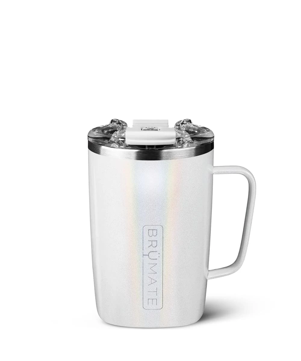 16 Oz Insulated Mug; 24+ Hours Cold; 4+ Hours Hot; BevLock Leakproof Lid; Left And Right Hand Friendly; No Condensation; No Metallic Taste; Non-Slip Base; 5.5″ Height; Color: Glitter White; Style #TD16GW