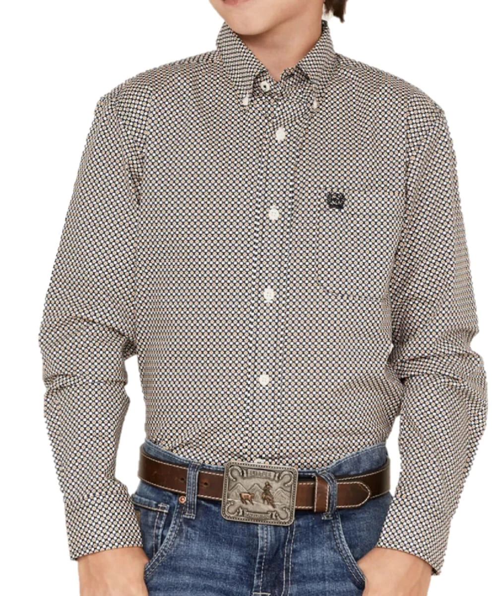 100% Cotton; Printed Plain Weave; Long Sleeve; Button Down Collar; Open Left Chest Pocket With Logo Embroidery; Button Down Placket; Cream Buttons; Button Cuffs; Dotted Geometric Print; Color: Brown; Style #MTW7060294