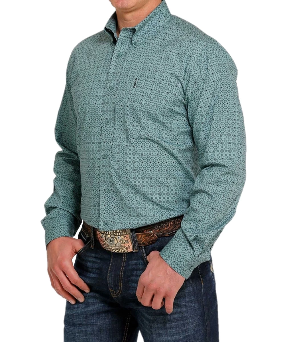 Printed Cotton Plain Weave; Button Down Collar; Long Sleeve; Blue Buttons; Button Down Placket And Cuffs; Single Open Left Chest Pocket With Logo Embroidery; Straight Yoke On Back; Color: Ocean Blue With Black Geo Print; Style #MTW1347059