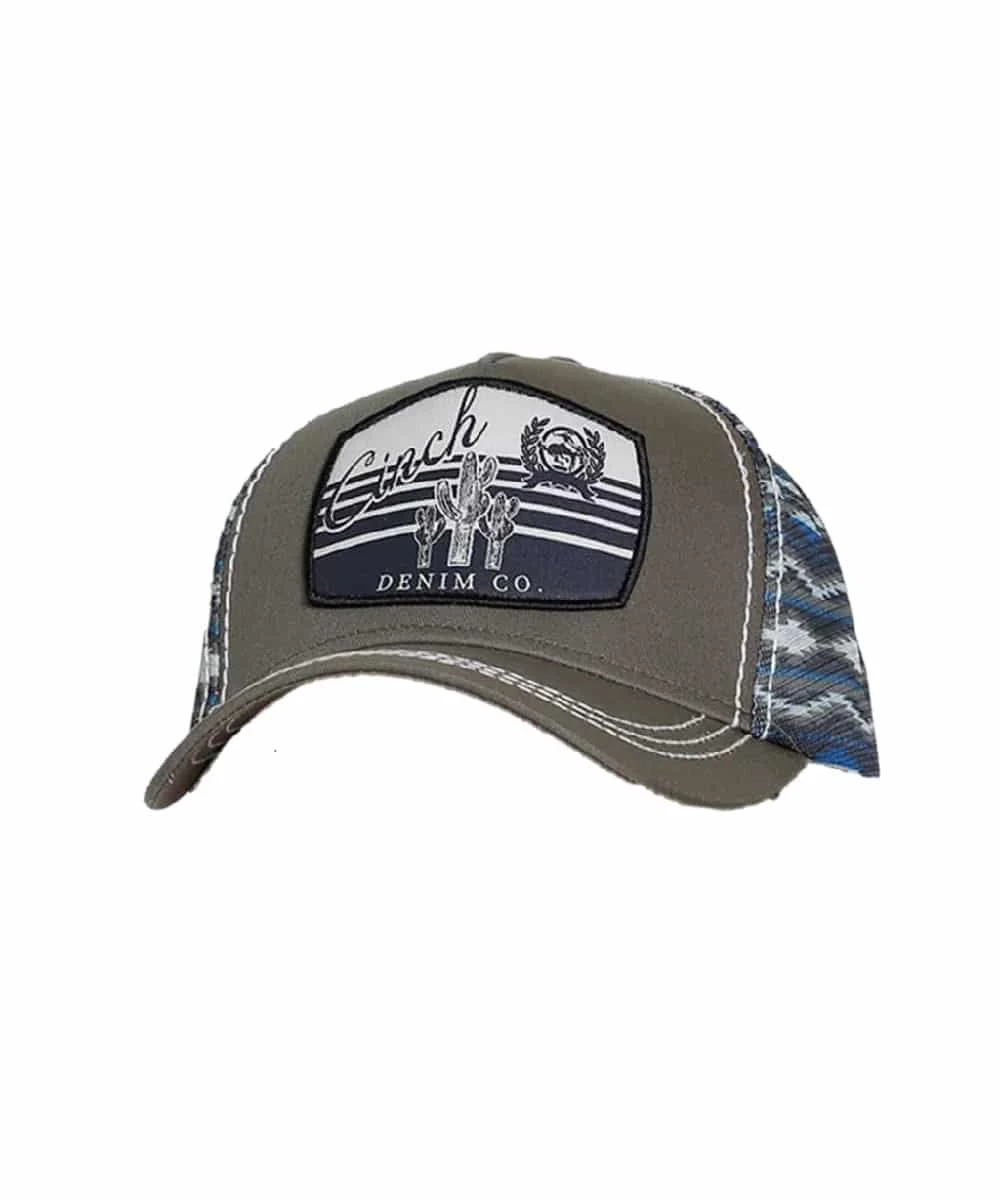 Olive Trucker Cap; 5-Panel; Mid-Profile; Curved Brim; Blue Aztec Pattern On Sides And Back; Cinch Logo On Front; White Stitching On Brim And Sides; Style #MHC7874034