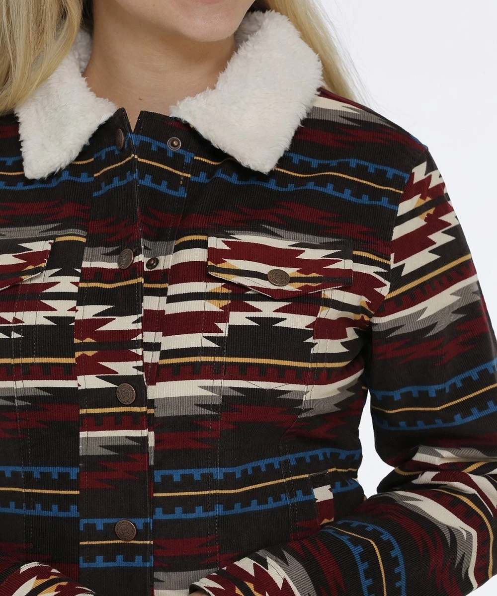 Cotton Spandex Blend; Color: Black/Maroon/Blue/Grey Aztec Print; Sherpa Fleece Collar; Two Snap Flap Pockets; Sherpa Fleece Lining; Copper Snaps; Hand Pockets; Faux Leather Logo Label; Style #MAJ9878005