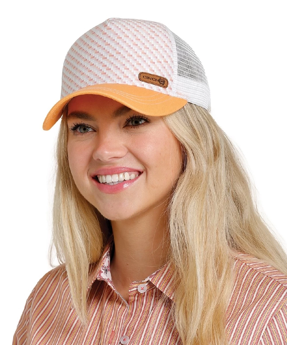 Five Panel Construction; Orange, Pink And White Design Front Crown; Orange Bill; White Mesh Back; Faux Leather Cinch Logo Patch On Left Front Center Crown; Snap Back Closure; Style #MHC7874027