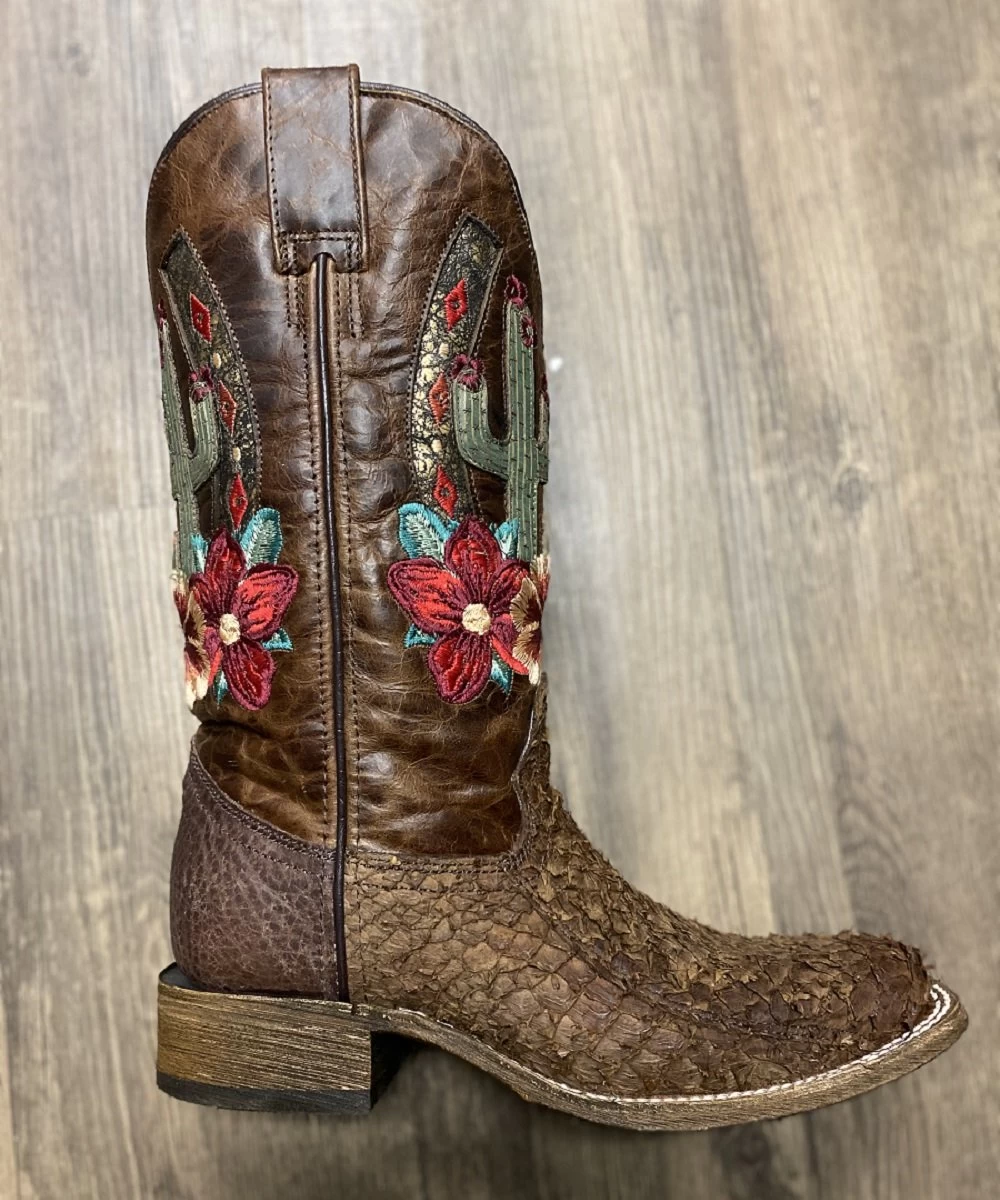 Premium Leather/Brown Fish Leather Foot; Leather Lining; Cushion Insole; Beautiful And Intricate Underlay And Embroidered Cactus And Flower Design On Shaft; Double Stitch Welt; Square Toe; Walking Heel; Leather Outsole; Style #A3912