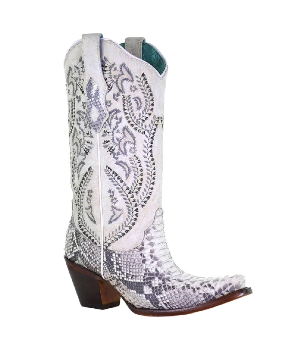 12″ Shaft; Full Grain Leather; Genuine Python Foot; Leather Lining; Embroidered Shaft; Cushion Footbed; 2 1/2″ Western Heel; Snip Toe; Color: Gray And Ivory/Bone; Leather Outsole; Style #A4135