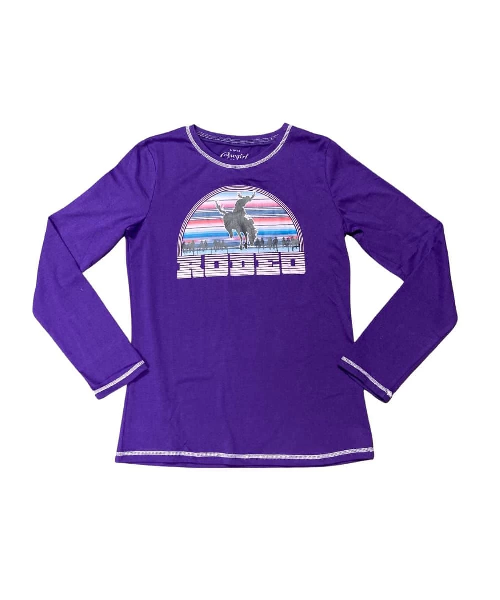 65% Polyester/ 35% Rayon; Color: Purple; White Contrast Stitching; Design Is Bucking Bronco With Serape Background; Design Says “Rodeo”; Long Sleeves; Style #415476-190-K