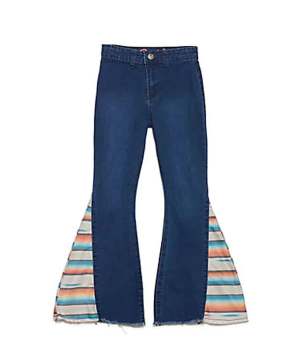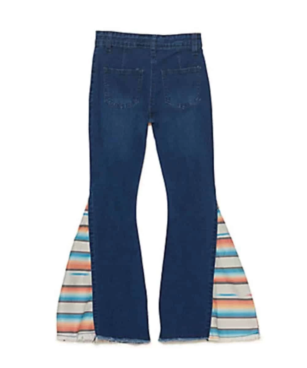 79% Cotton, 20% Polyester, 1% Spandex; Medium Wash; Mid Rise; Two Open Back Pockets; Button Fly Closure; Belt Loops; Adjustable Waist; Raw Hem Bottom; Bell Bottom Flare; Style #802101-450-JT