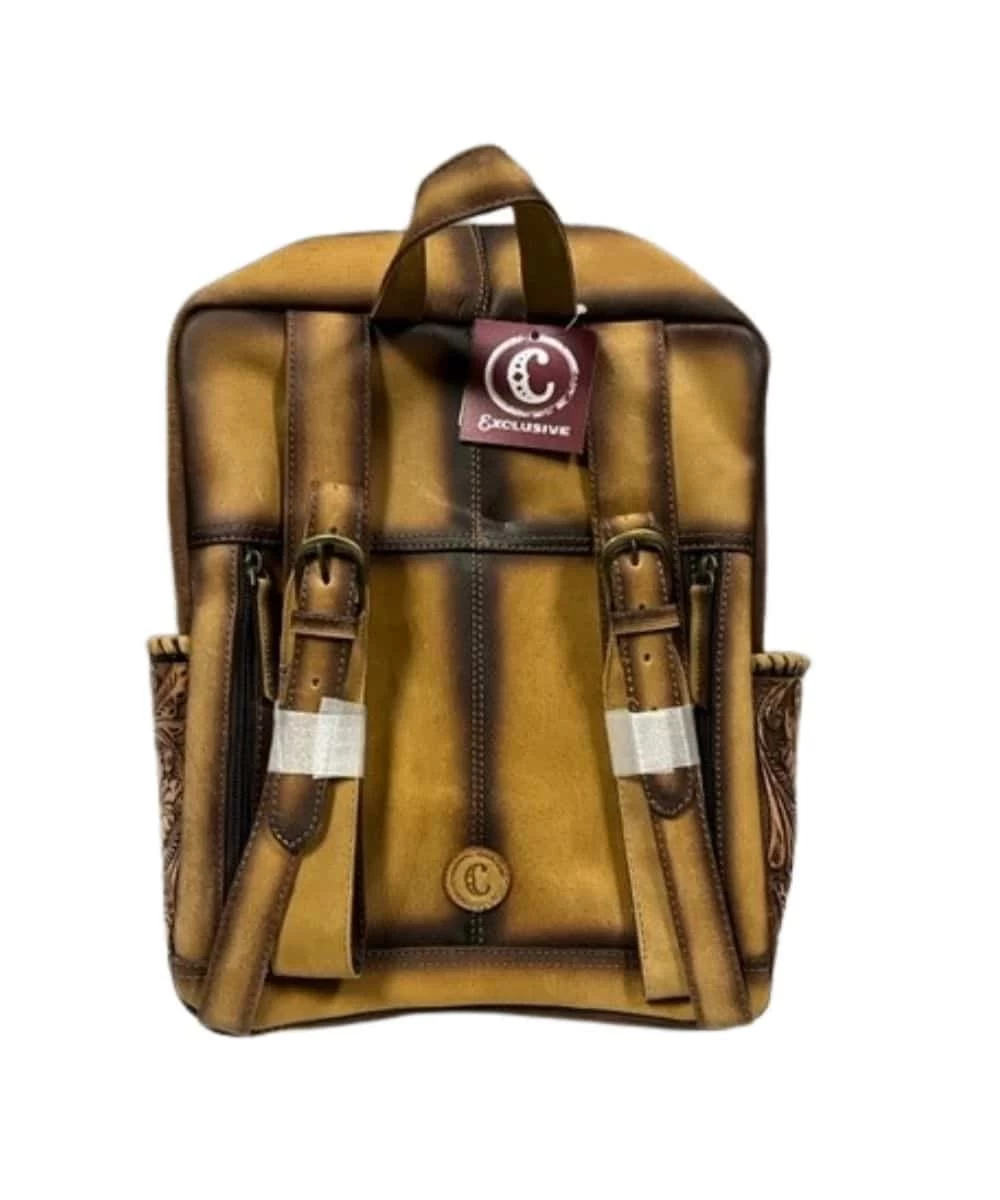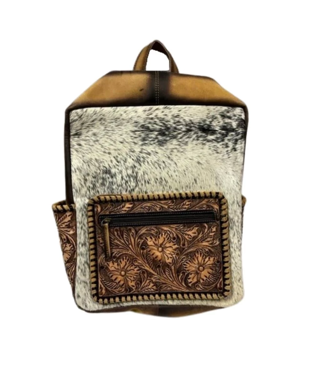 Hair On Leather; Loop On Top For Carrying; Small Floral Embossed Leather Front Zip Closure Compartment; One large Zip Closure Compartment Contains A Single Open Pocket and Single Zip Closure Compartment; Leather Embossed ‘C’ On Inside; Two Floral Embossed Leather Open Side Compartments; Adjustable Shoulder Straps; Zip Closure Concealed Carry Pocket On Back; Leather Embossed ‘C’ Patch Signifying It As One Of Our Cowpokes Exclusive Bags; Measures Approximately 12″ L x 5″ W x 15″ H; Style #10A-860