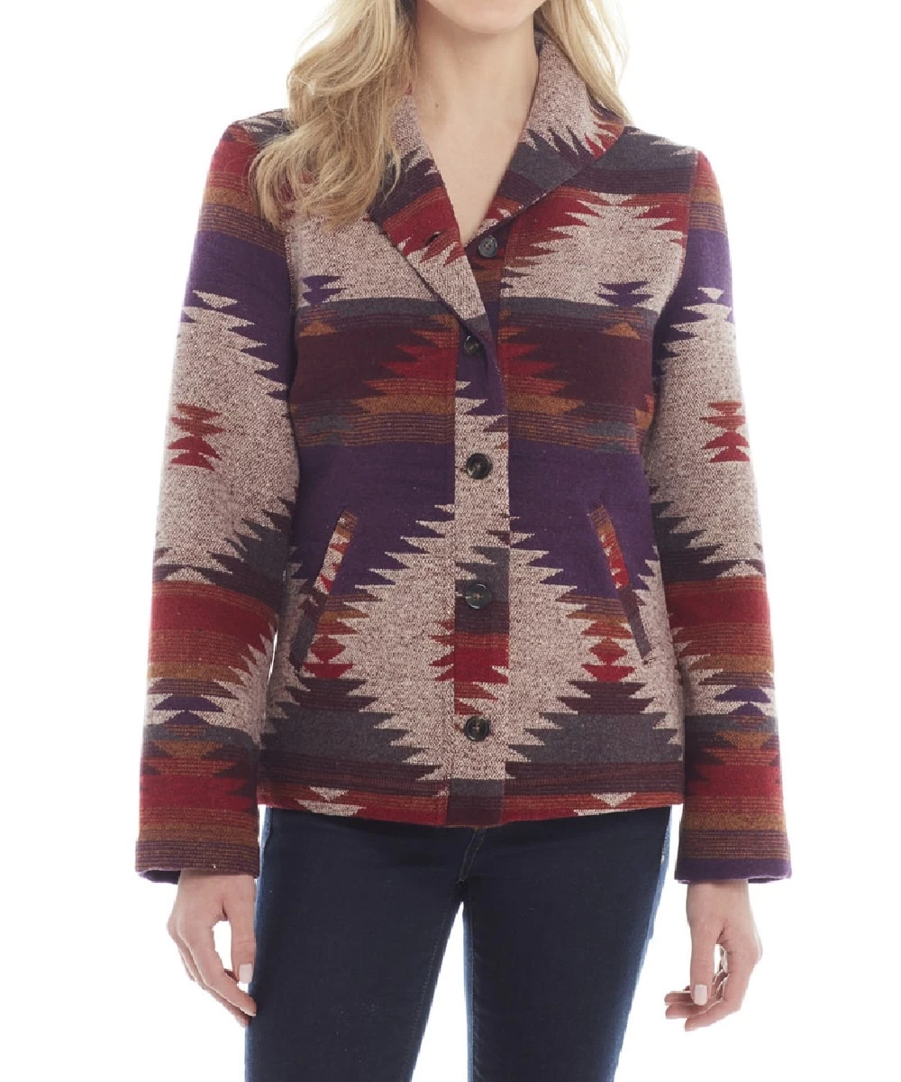 100% Polyester; Plum Navajo Print; Button Down; 2 Front Side Pockets; Style #CR15749
