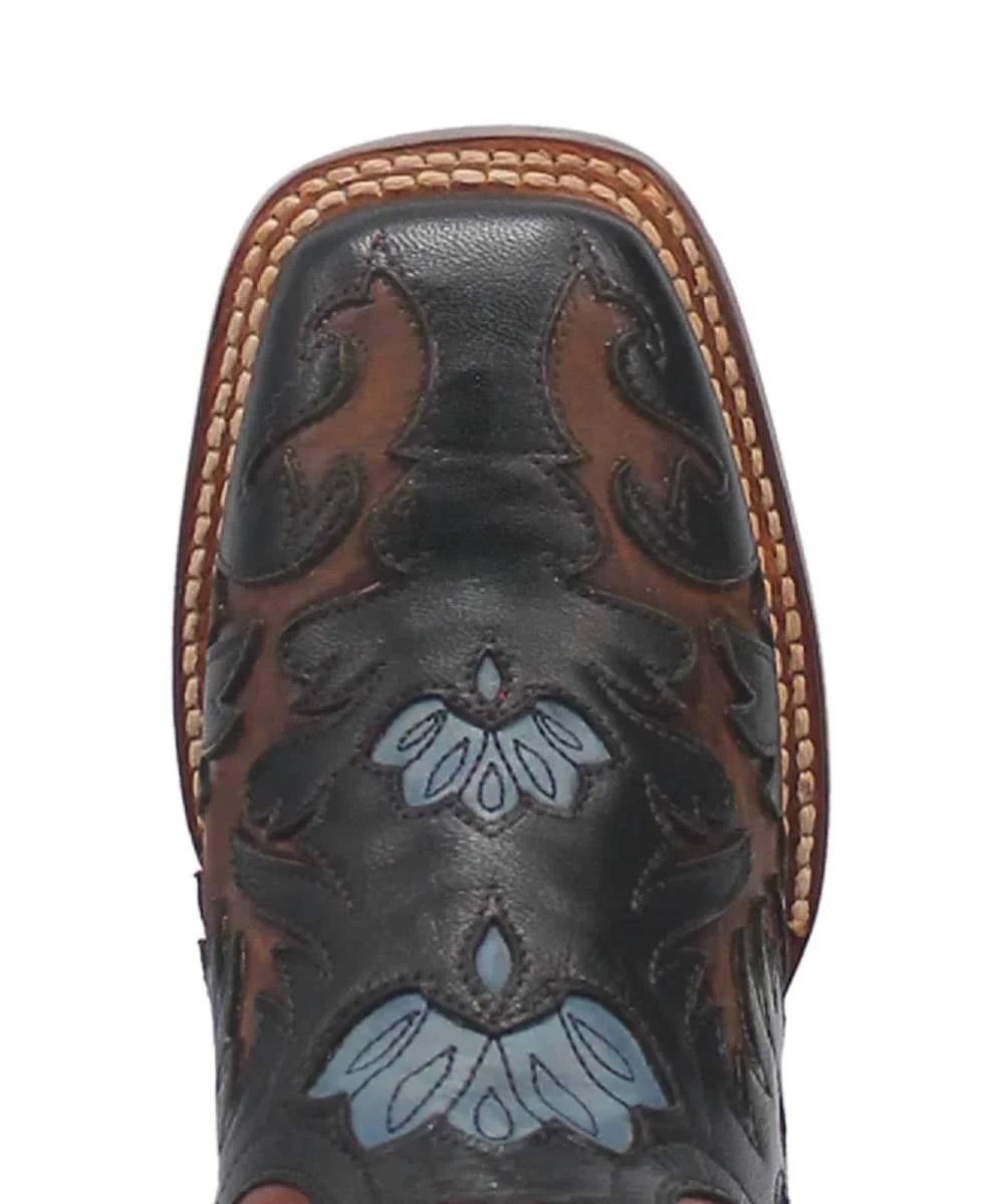 11″ Boot; Leather; Soft Leather Cutouts With Blue, Cream And Brown Underlay Flowers And Leaves Stretching From The Foot To The Top Scalloped Top Line; Leather Lining; Removable Antibacterial And Antifungal Soft Strike Orthotic; 1″ Stockman Heel; Broad Square Toe; Leather Outsole; Style #DP4109