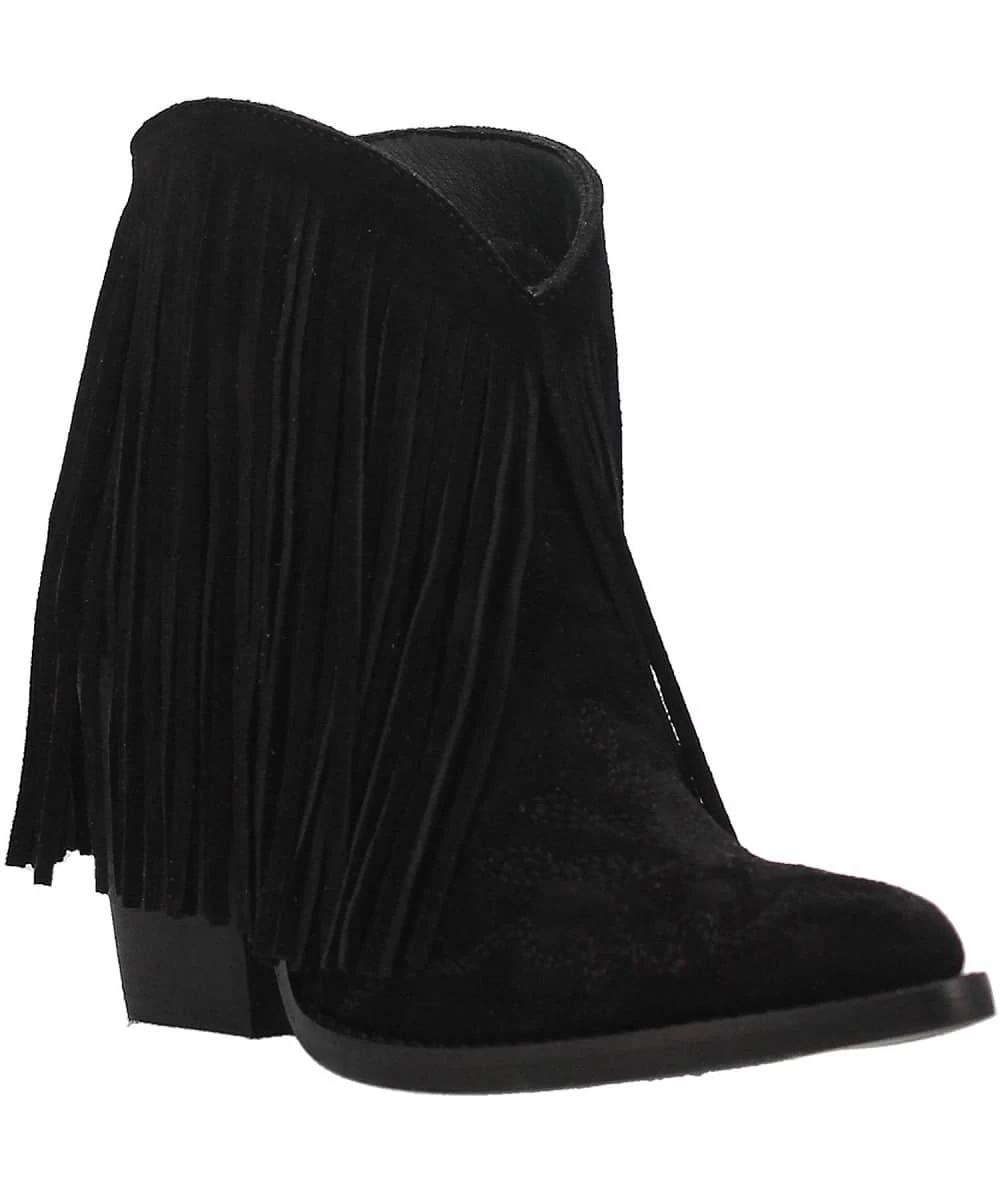 6″ Boot; Black Leather; Hinged Cushion Insole; Leather Fringe Shaft Detail; Unit Heel; Snip Toe; TPR Unit Outsole; Style #DI908-BK