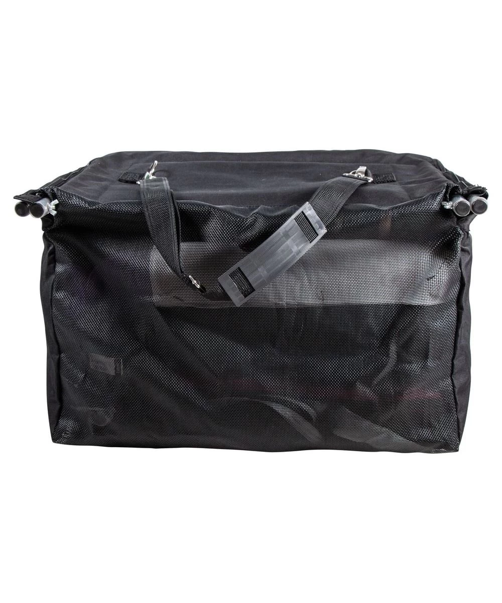 600D Poly Fabric; Mesh Backside And Bottom; Framed Top Lid With Zipper Closure; Easy Stay Open Round Metal Framed Lid With A Zipper Closure For Storage To Help Prevent Dust Buildup And Keep Items Organized; Can Be Used As An Open Top Hay Feeder And Fits 2 Flakes Of Hay; Used As A Sheet Or Boot Storage Bag On The Front Of Stall; Filled Measures: 15″ D x 16″ H x 23 1/2″ W; Convenient Removable Carrying Strap Can Double As A Hanging Strap On Stall Door; Includes Shoulder Protector For Carrying; Color: Black; Style #41346