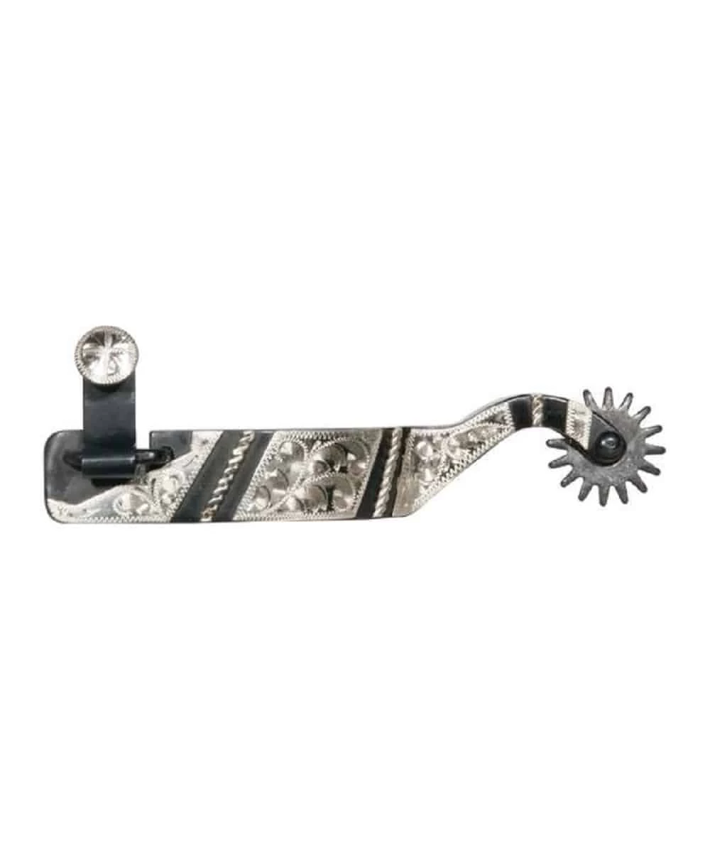 Band Width: 7/8″; Heel Width: 3″; Neck Length: 2″; Rowel Diameter: 1″; Multi Pointed Rockgrinder Spur Can Be Severe If Not Used Correctly; Sensitizes The Contact Point To Increase Responsiveness Instantly; Crafted From Stainless Steel With Highly Polished Black Finish; Engraved Sterling Silver Plate Overlay On The Outer Side; Hinged Spur Button Allows Straps To Be Attached Easily; Should Not Be Used By Inexperienced Or Novice Riders; Style #19441 LDS