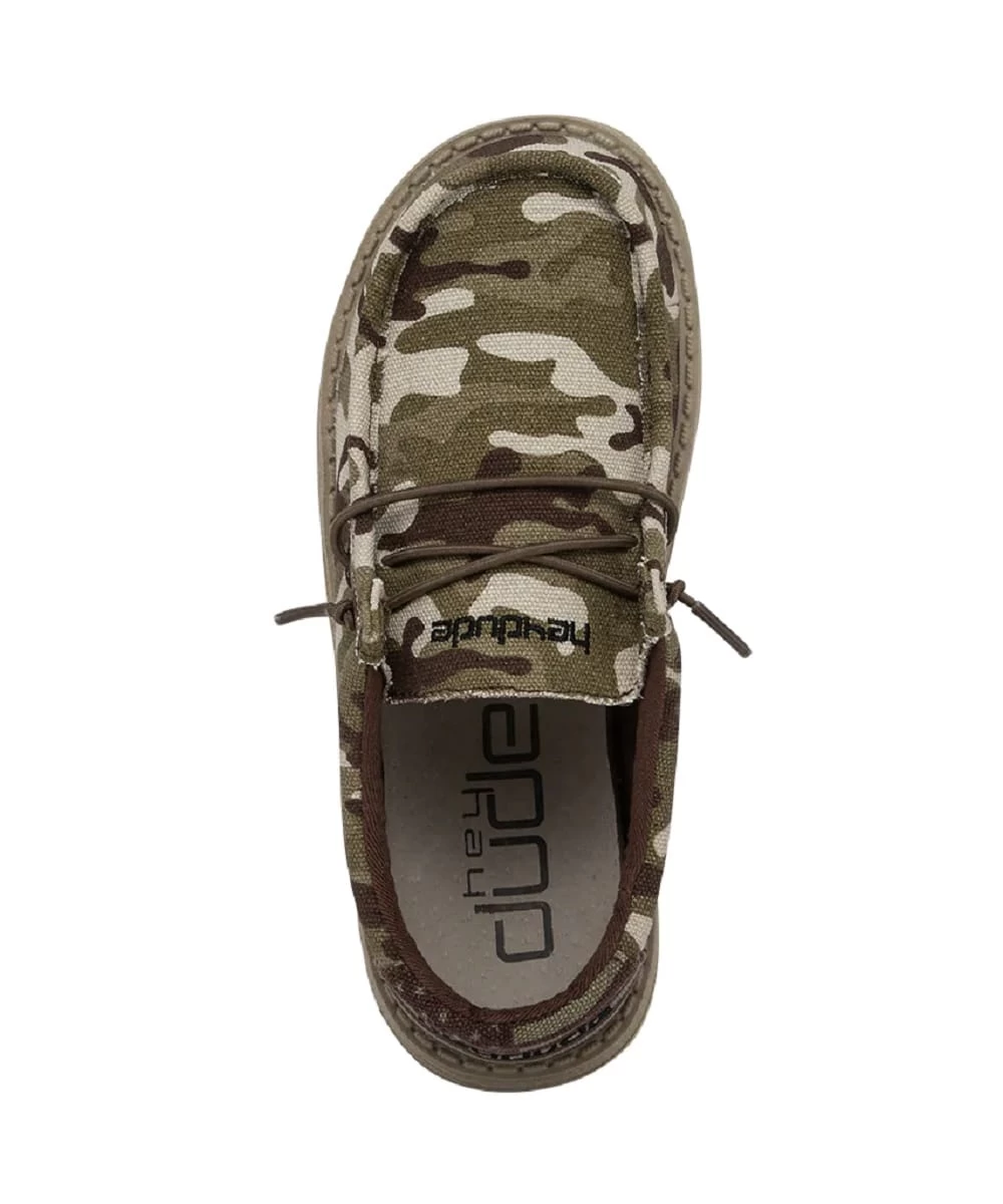 Canvas Upper; Cushioned Insole; EVA Outsole; Padded Collar Around Ankle; Slip On; Adjustable Brown Elastic Laces; Camo Flag And Brown Shoes; Style #130137037