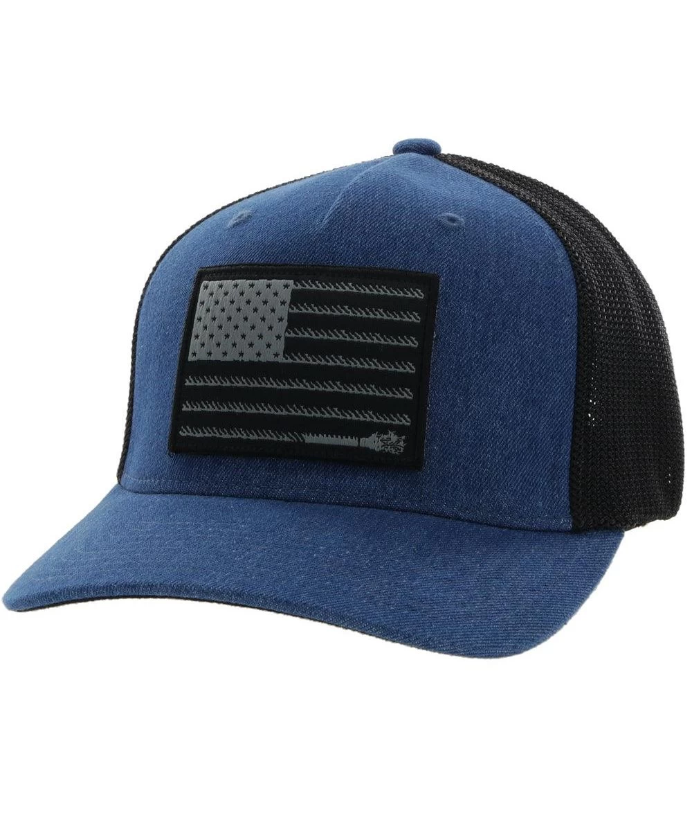 5 Panel Construction; Mid-Profile; Denim Front; Curved Bill; Black/Grey Patch; FlexFit Cap; Black Mesh; Style #2210DEBK
