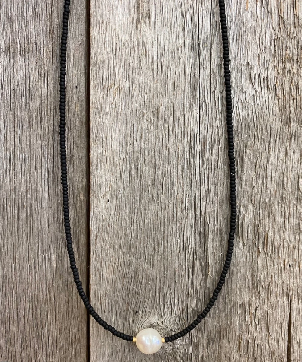 16″; Black Seed Bead; Freshwater Pearl Center; Bronze Lobster Claw Clasp; Style #16994