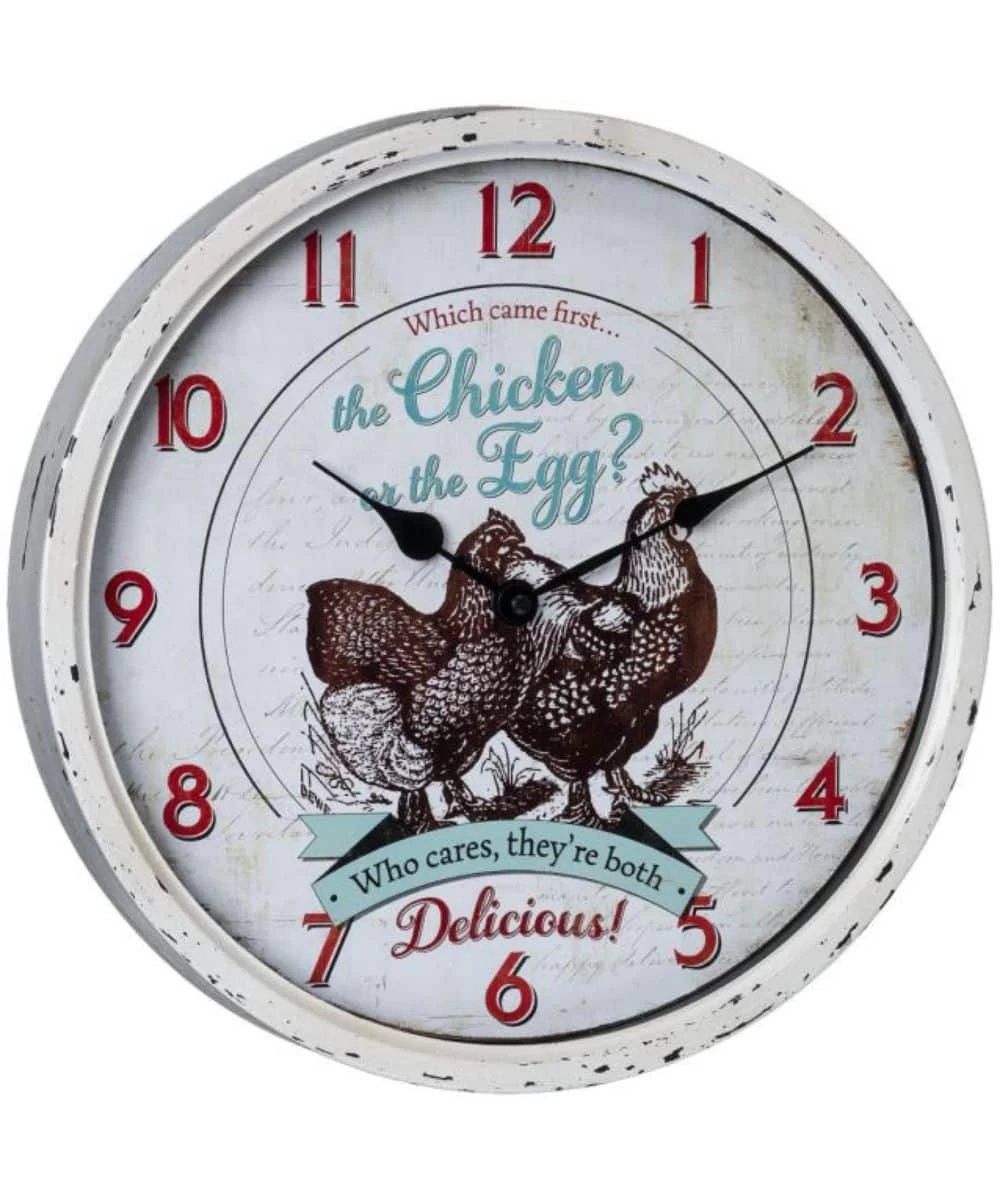 Weathered Metal Finish; Glass Clock Cover; Farmhouse Style; Country Chicken Design With Quote; Batteries Not Included; Hook For Hanging On Wall; 13.75″ x 2″; Style #87-1608-0-0