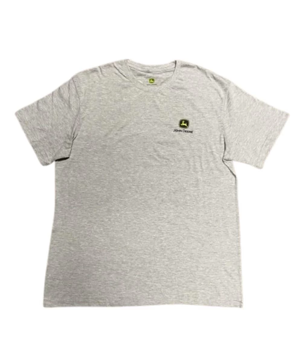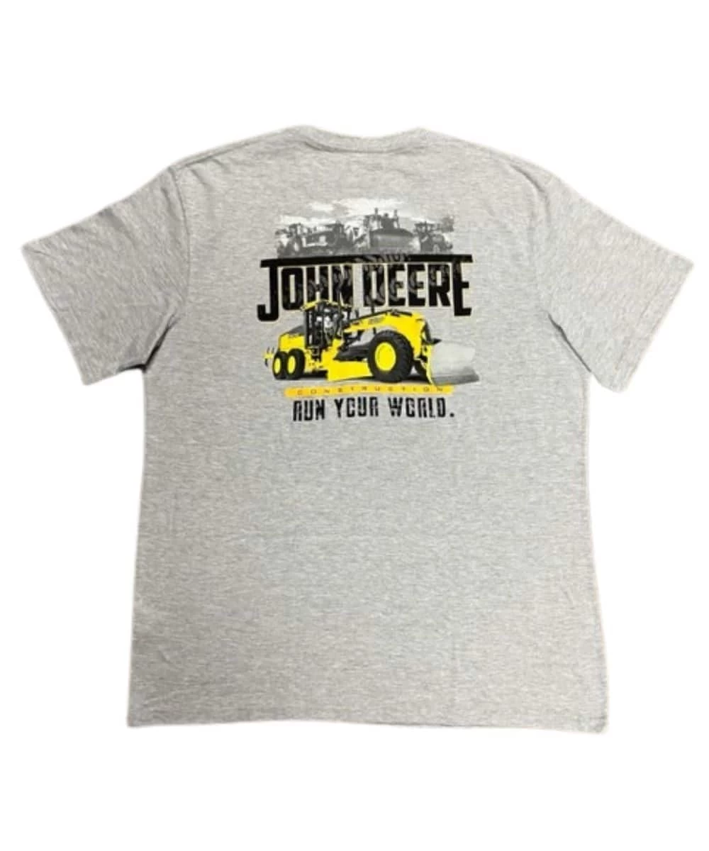 60% Cotton/40% Polyester; Color: Heather Grey; Short Sleeve; Small Left Chest Black/Yellow Logo Graphic; Large Black/Yellow Excavator Graphic On Back That Reads ‘John Deere Construction, Run Your World.’; Style #13002181