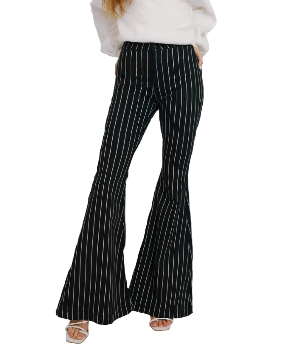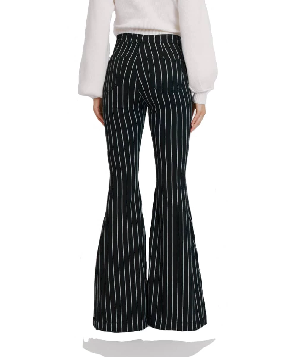 57.9% Cotton/18.3% Rayon/14.8% Polyester/7.8% ZT800/1.2% Lycra; High Rise; 11″ Rise; 34″ Inseam On Size 5; Button Closure With Zipper Fly; Back Dart Detail; Super Flare Leg; 16″ Leg Opening; Black Pin Stripe; Style #KC6247GBS