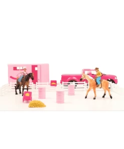 The Perfect Barrel Racing Toy Set For Your Little One; It Has Everything Necessary To Be A Champion Barrel Racer In Your Child’s Heart; Includes 11″ x 3-1/2″ x 3-1/2″ Truck, 8″ x 3-1/2″ x 5″ Trailer, 2 Cowgirls, 2 Horses, 2 Saddles, 3 Barrels, Feeders With Hay And Fencing. 3″ Figures; Style #50644