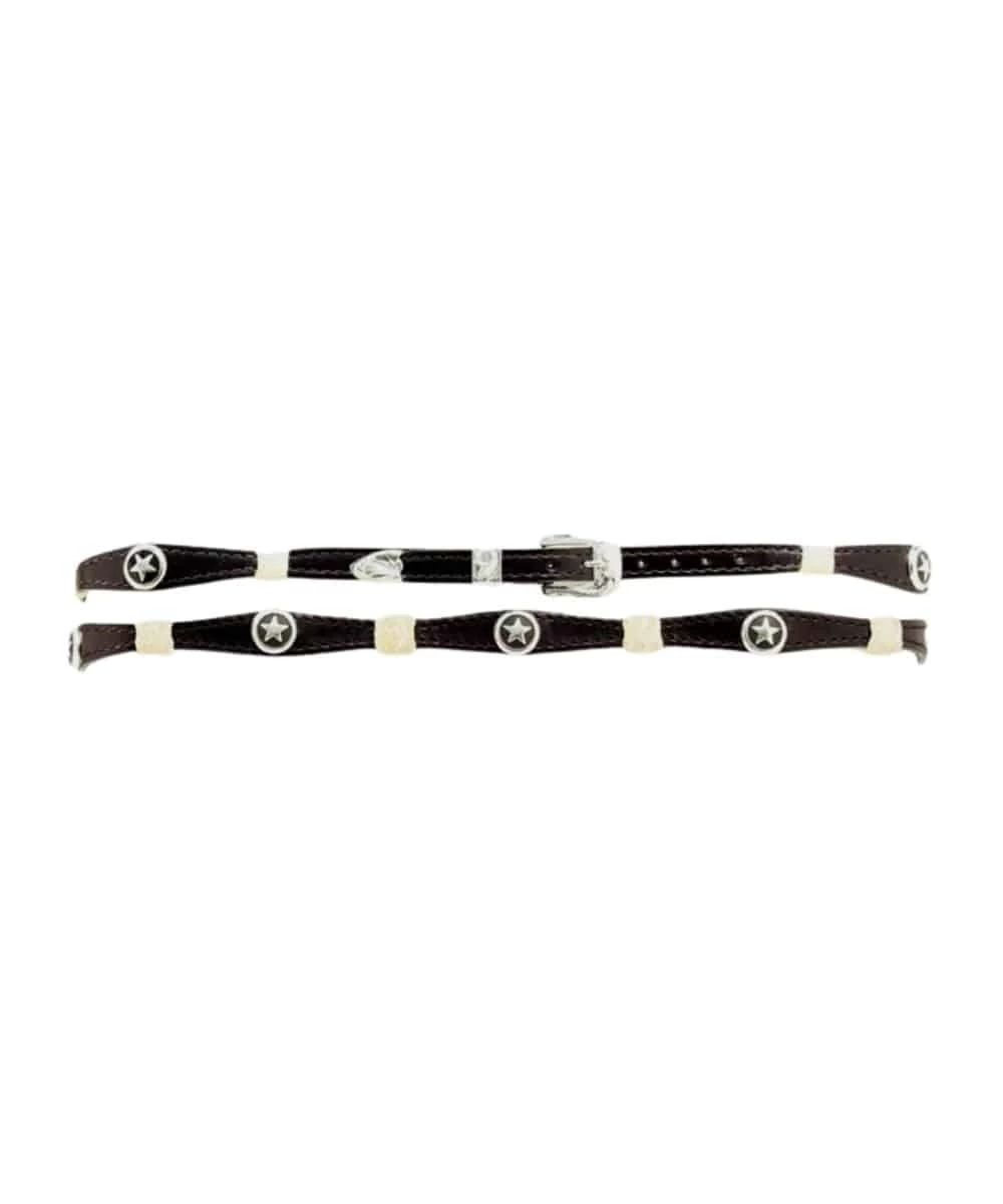 Genuine Leather; Medium Brown Color; Scalloped Edges; Silver Concho Stars; Raw Hide Embellishments; 3 Piece Buckle Closure; Measures Approximately: 27″ x 3/8″; Style #0297001
