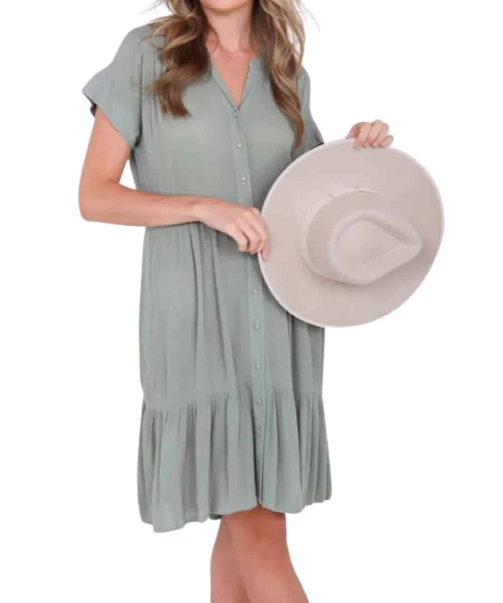 100% Rayon; Color: Light Olive; V-Neck; Button Down Front; Short Sleeves; Drop Waist; Knee Length; Tiered Skirt; Style #THE JORI