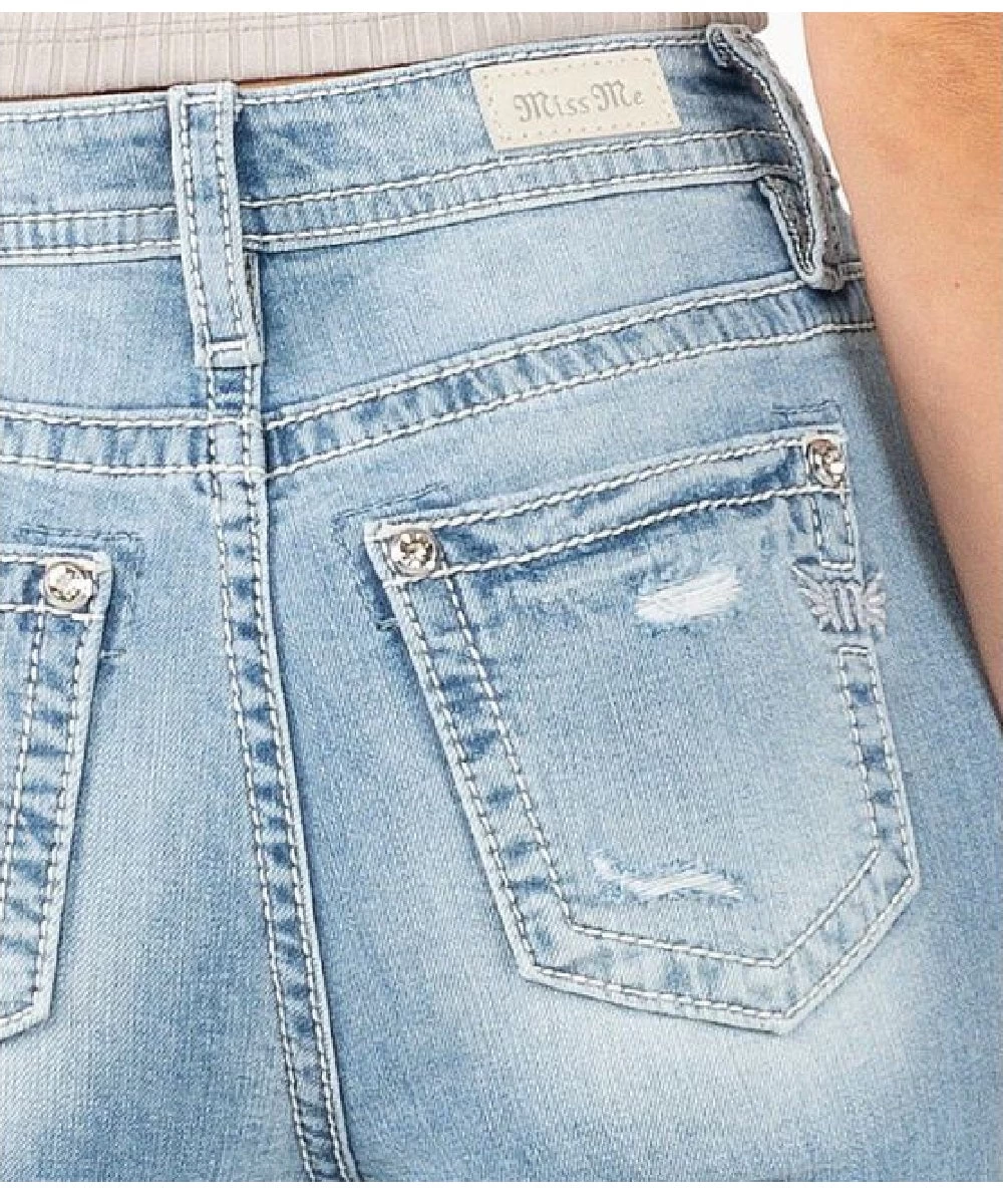 Mid Rise; Five Pocket Design; Light Wash; Slight Destruction On Left Leg And Back Pockets; Rolled Hem; Style #M3636H47