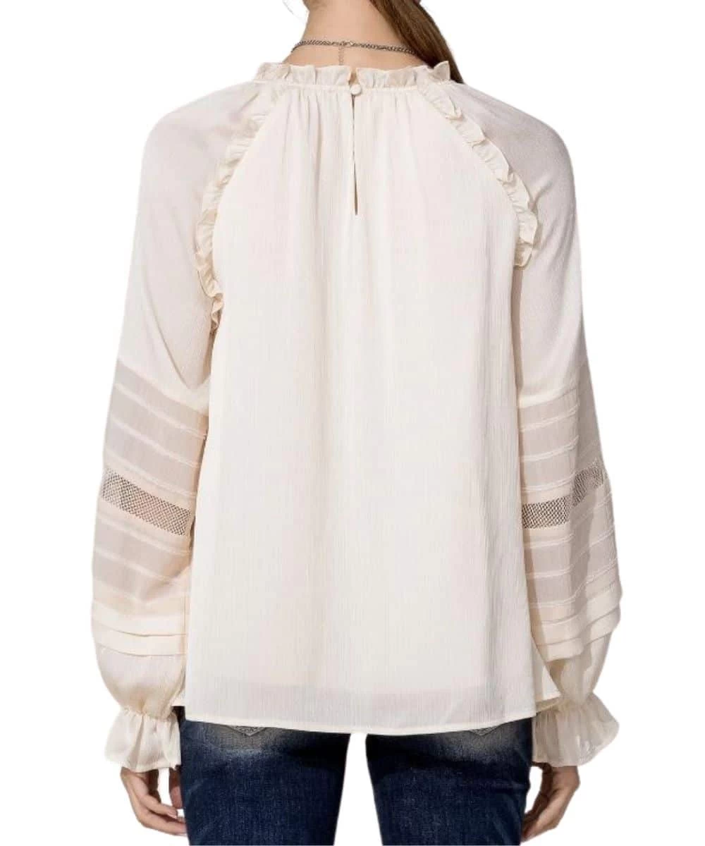 100% Polyester; Lining: 100% Rayon; Color: Cream White; Ruffle Neck; Illusion V-Neck With Mesh Material; Balloon Sleeves; Sleeves Have Chiffon Strips With Sparkly Raw Hem Between Them; 1 Strip Of Mesh In Sleeves; Pleats In Sleeves Towards Wrists; Elastic Along Wrists With Ruffle Detail; Back Has Working Button Along Neck; Style #MT2512L