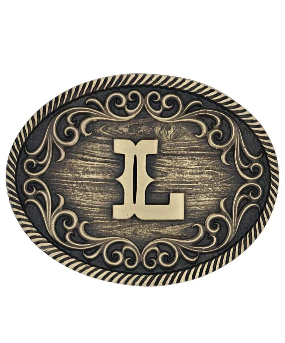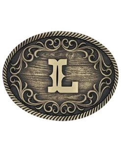 Brass Over White Metal Alloy; Oval Belt Buckle; Silver/Gold Toned With Rope Trim; Big, Bold Classic Filigree; L Initial In Center; Standard 1.5″ Belt Swivel; Measures Approximately: 3.8″ W x 2.96″ H; Style #A915L