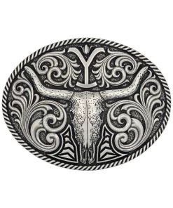 Silver Over White Metal Alloy; Oval Shaped Belt Buckle; Silver Tone With Yellowstone Brand “Y” At The Top; Longhorn Skull In Center, Surrounded By Filigree Background; Rope Edge Trim; Standard 1.5″ Belt Swivel; Measures Approximately: 3.28″ W x 3.89″ H; Style #A960YEL