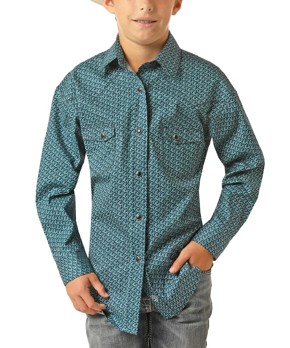 100% Cotton; Long Sleeve; Spread Collar; Black Snap Closures; Snap Front And Cuffs; Two Snap Flap Chest Pockets; Single Point Front Yokes; Teal, Turquoise And White Horseshoe Print; Color: Turquoise; Style #RRBSOSRZ80