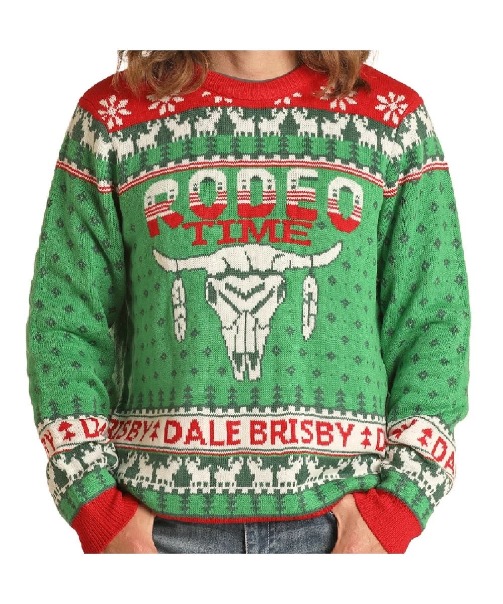 100% Acrylic; Colors: Green/Red/White; Christmas Theme; Unisex Fit; Crew Neck; “Rodeo Time” Across Front; “Dale Brisby” Along Waist; Long Sleeve; Style #RRUT32R0LB