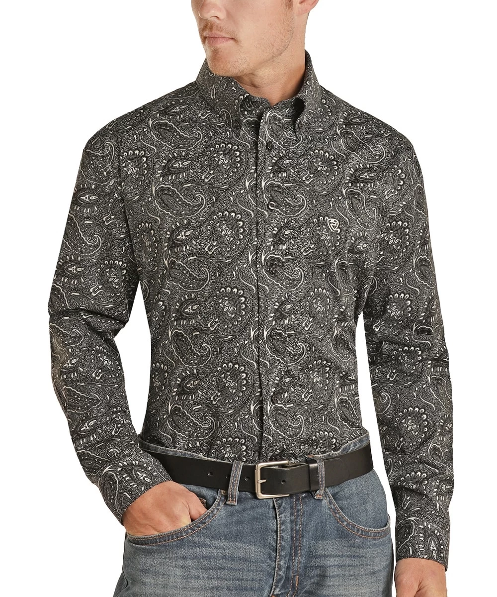 Long Sleeve; Button Down Collar, Front And Cuffs; Single Open Chest Pocket With Logo Embroidery; White Paisley Print; Black; Style #RRMSODR08Z