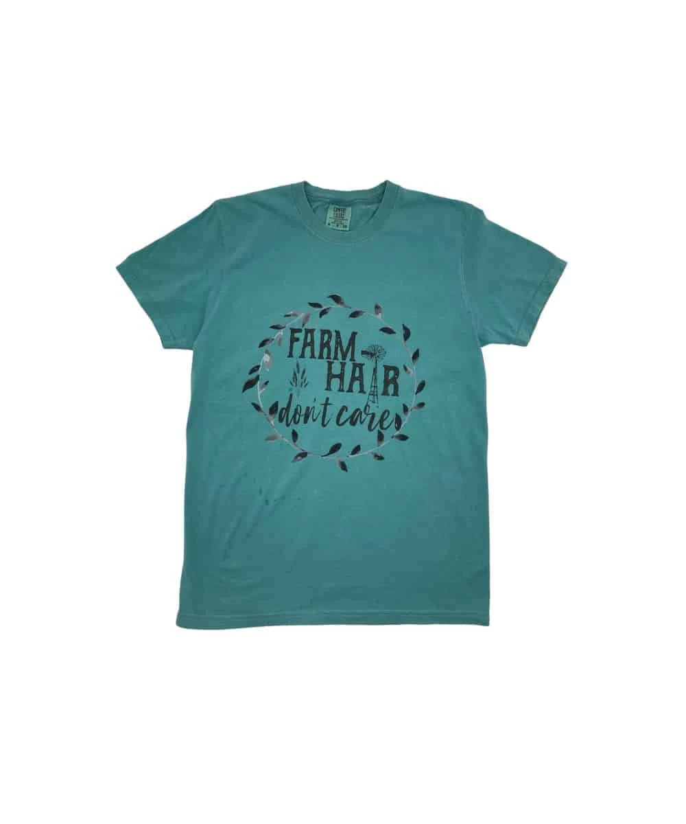100% Cotton; Color: Teal; Design On Front Says “Farm Hair Don’t Care”; Design Has Windmill, Wheat, And A Circle Of Greenery Around Everything; Crew Neck; Short Sleeves; Style #FARM HAIR DONT CARE TEE