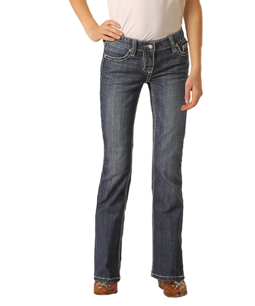 98% Cotton/2% Spandex; Medium Vintage Wash; Whiskers; Sanding; Five Pocket Styling; Fashion Back Pocket; Boot Cut; Style #G5-2721