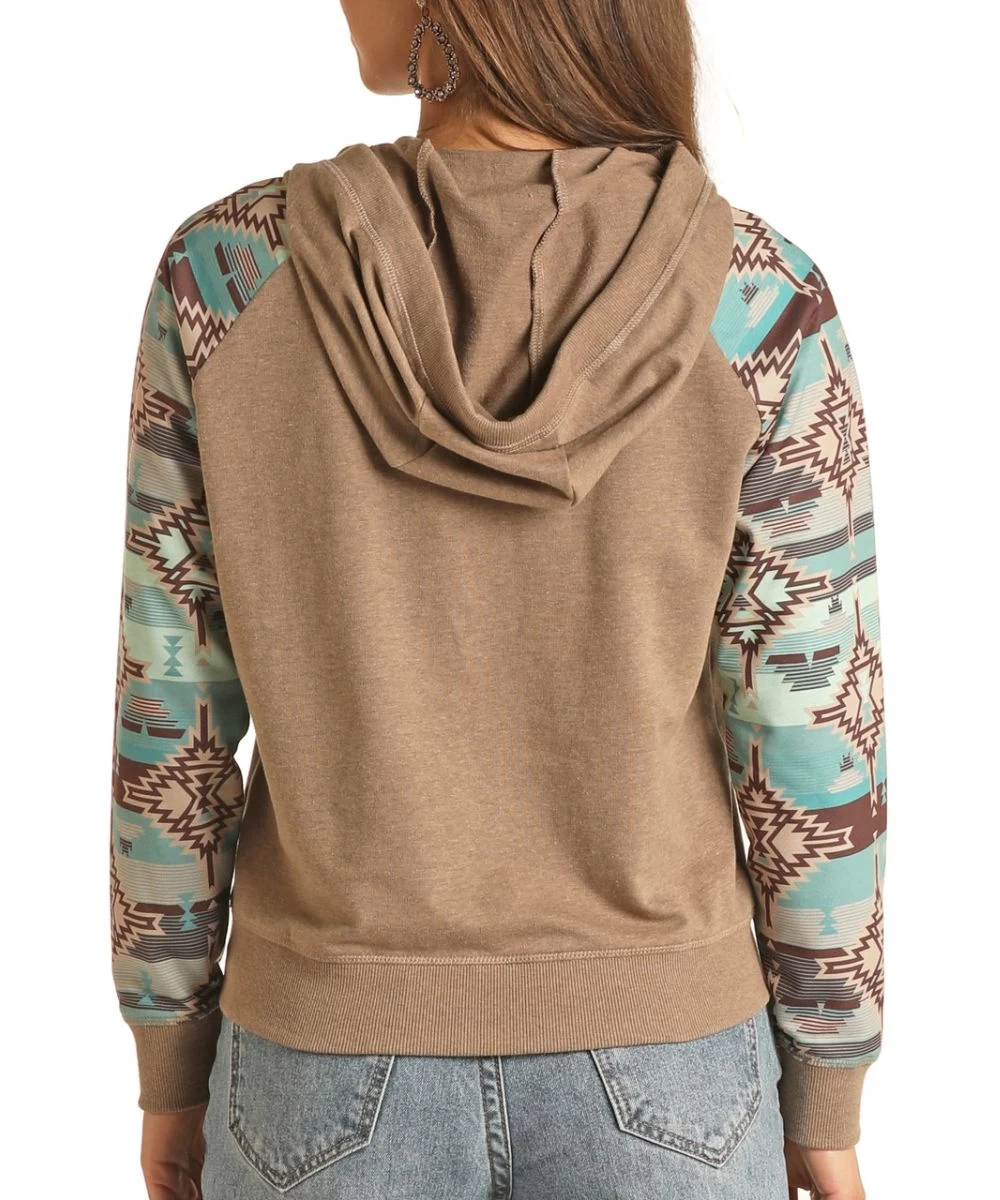 60% Cotton/40% Polyester; Long Sleeve; Drawstring Hooded Sweatshirt; 4 Snap Placket; Contrast Aztec Sleeves; Ribbed Sleeves, Cuffs, And Hood Trim; Kangaroo Pocket; Color: Turquoise/Brown; Style #RRWT94R0Y9