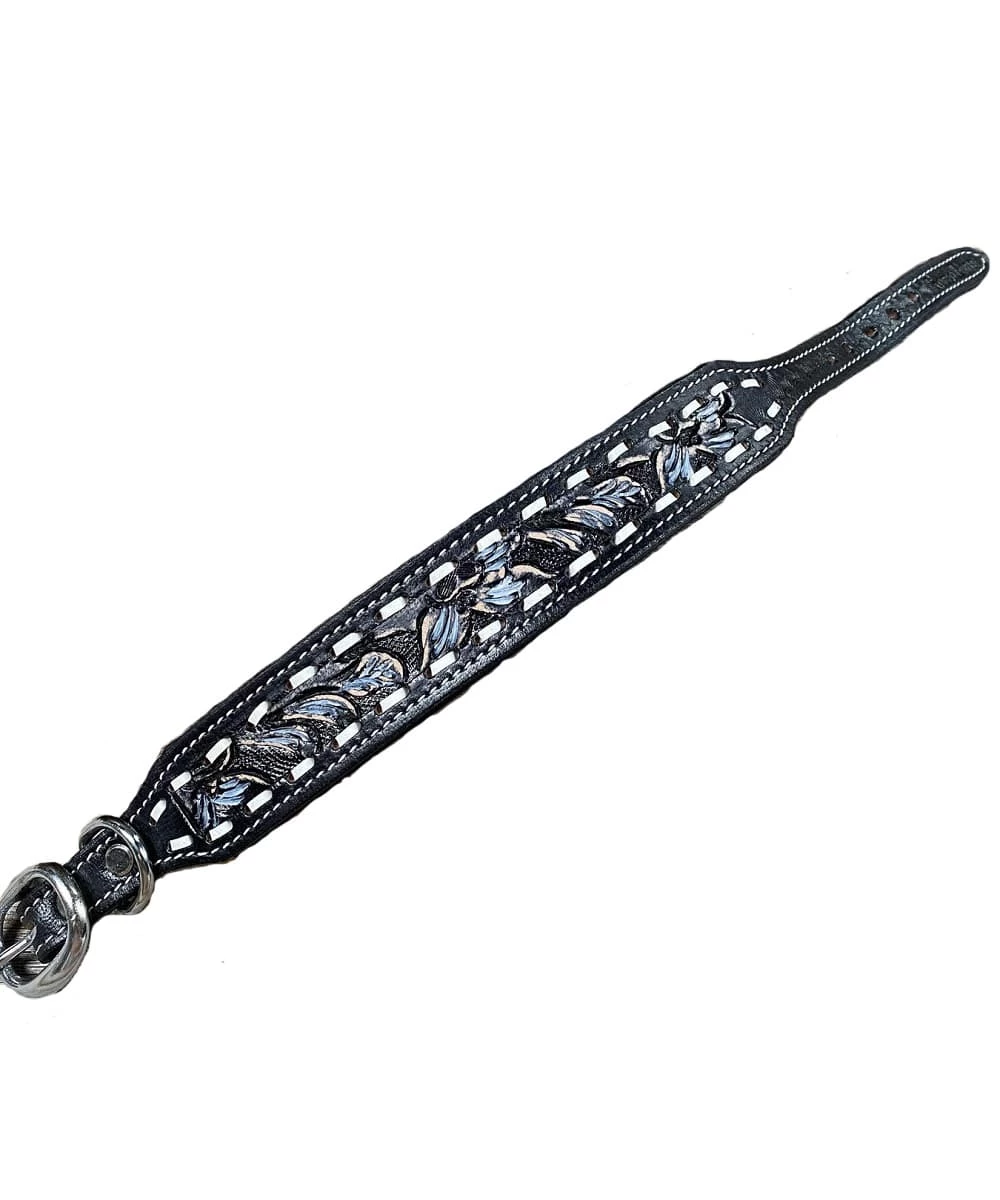 Leather; Hand Tooled Leaf Pattern; Hand Painted; Tooled Adjustment Straps; Neoprene Padded Neck; Silver Tone Buckles; Color: Black, Grey, Blue And Cream; Size Small Fits 13″-16″; Size Medium Fits 15″-18″; Size Large Fits 17″-20″; Extra Large Fits 19″-22″; Style #LL100
