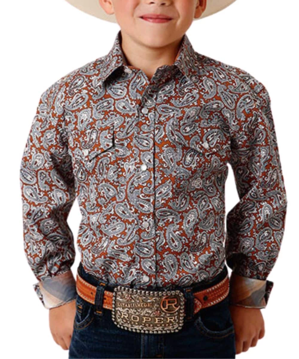 100% Cotton; Color: Copper Paisley; Spread Collar; Snap Front Closure; Pearl Snaps; 2 Single Point Pockets And Flaps; Snap Flap Pockets; “R” Embroidery On Left Chest Pocket; Long Sleeves; Wavy Print On Trim; Single Point Back Yoke; Style #03-030-0225-2020