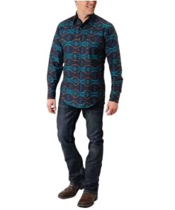 100% Cotton Poplin; Long Sleeve; Spread Collar; Snap Front Placket And Cuffs; Single Point Snap Flap Chest Pockets; Single Point Front And Back Yokes; Denim Interior Trim; Color: Blue Aztec Horizontal Print;