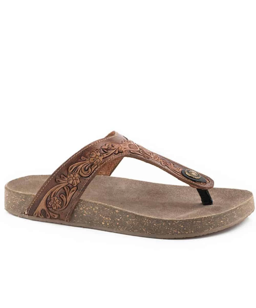 Floral Tooled Thong Sandal; Molded Cork Footbed Midsole; Gum Colored TPR Outsole; Soft Comfort Sock Liner; Color: Brown; Style #09-021-0607-2889