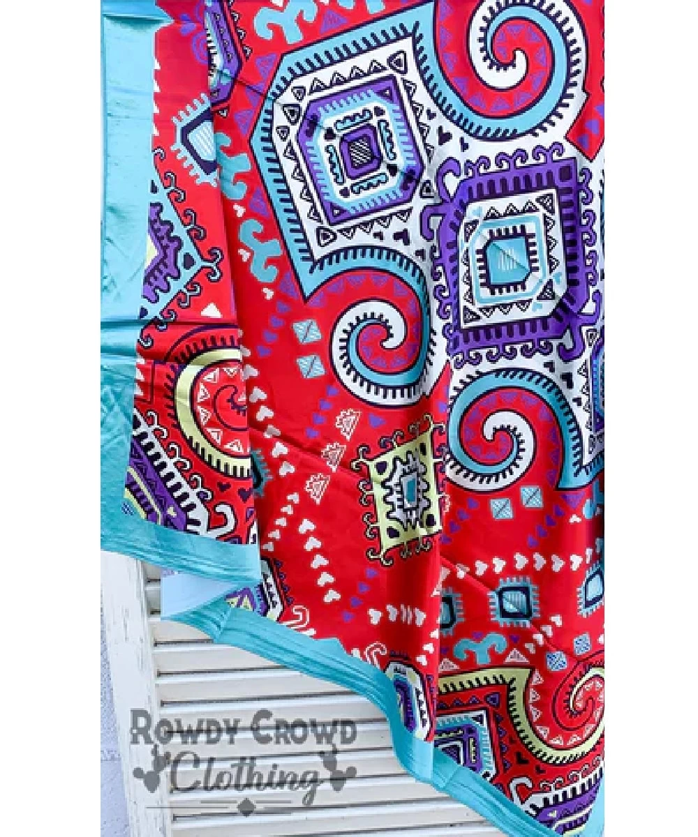 100% Polyester; Red, Light Blue, White, Black And Light Green Geometric Print; Measures Approximately: 36″ X 36″; Style #CABO WILDRAG