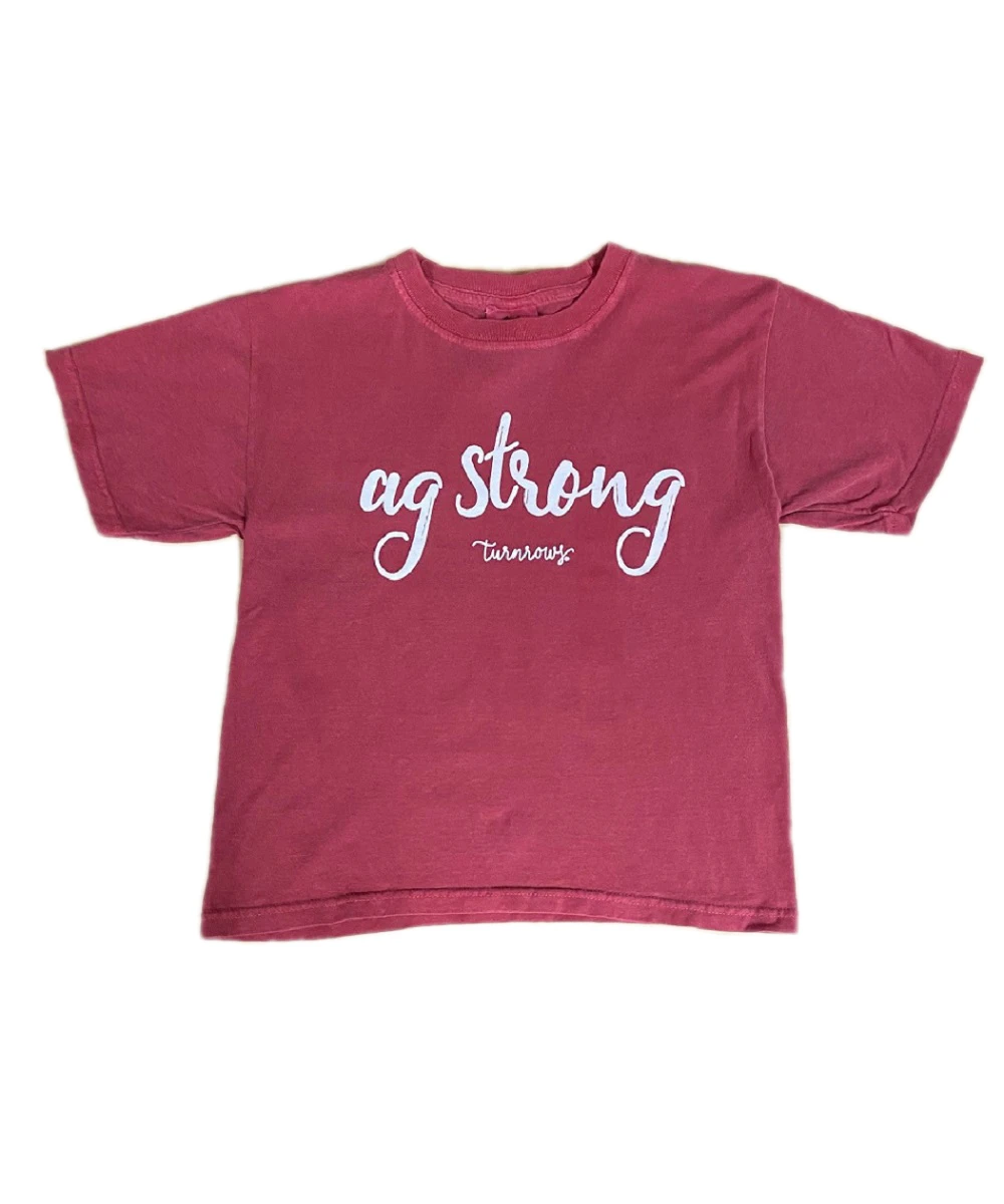 100% Cotton; Crew Neck; Color: Crimson Red; Front Print Reads: AG STRONG, TURNROWS; Style #TRW71C00AGS