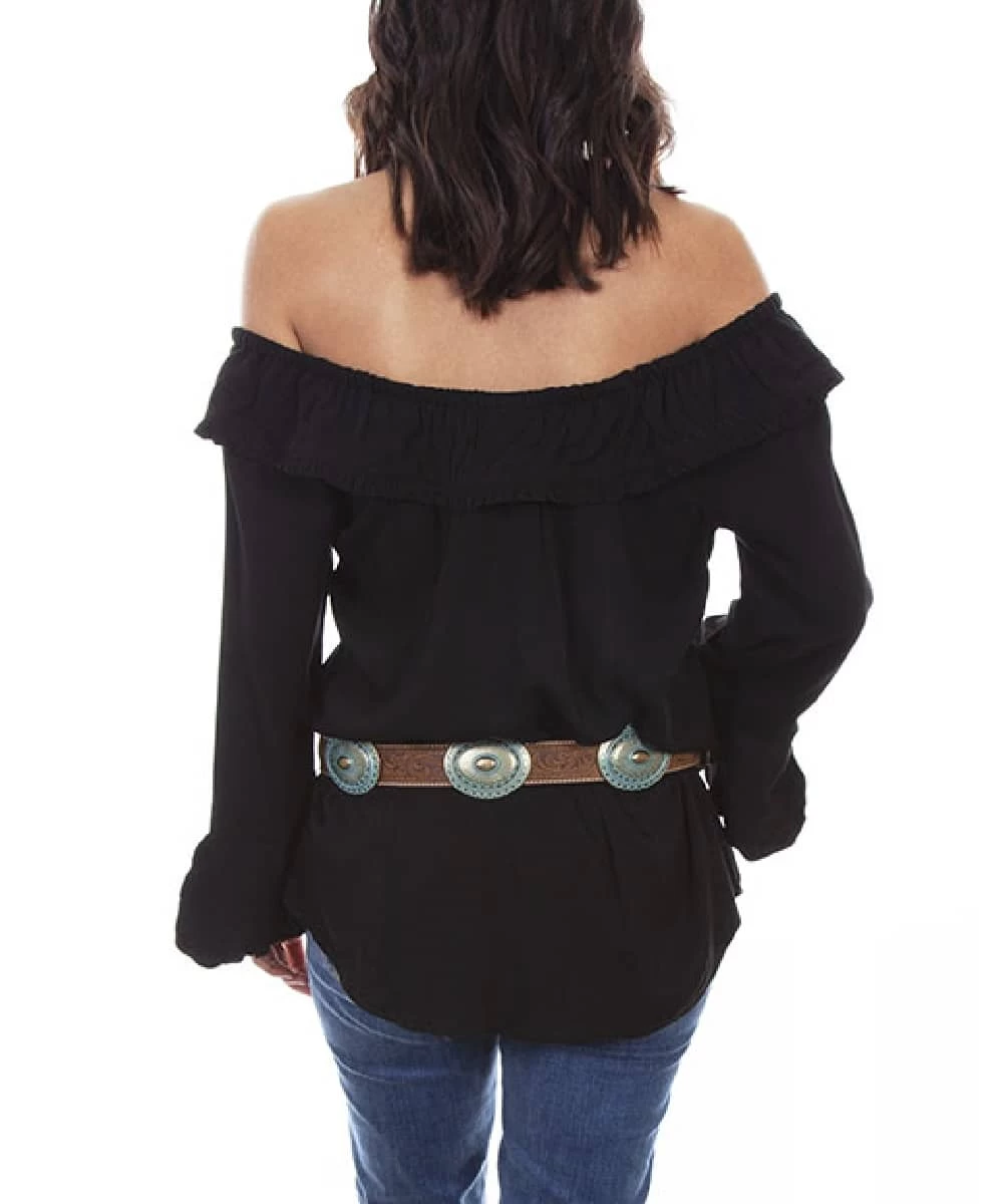 100% Rayon; Generously Cut With Loose Drapy Silhouette; On Or Off Shoulder Ruffled Collar; Long Sleeve Rolled Cuffs; Color: Black; Style #HC579