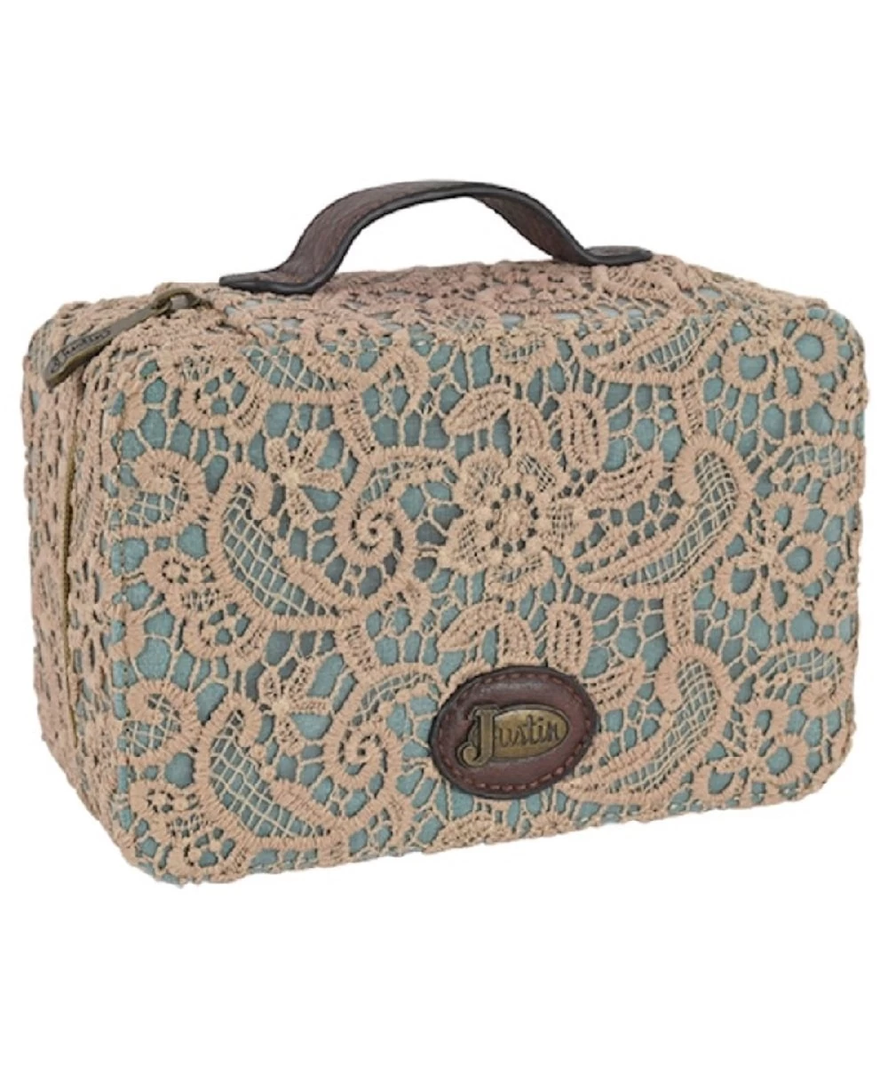 Justin; Turquoise Colored Organizer; Lace Overlay; 1 Interior Compartment With Removable Divider; Various Ring And Necklace Holders And Pockets; Zipper Closure; Measures Approximately: 8.5″W x 5.5″D x 3.5″H; Style #22114833LAC