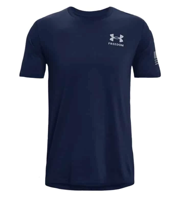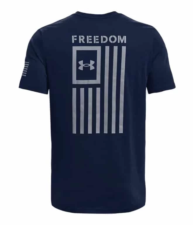 60% Cotton/40% Polyester; Super Soft; Ribbed Collar; Short Sleeve; Crew Neck; Grey Under Armour Logo On Front Left Chest; Grey Flag Print On Back And Left Shoulder; Color: Navy; Style #1370810-408