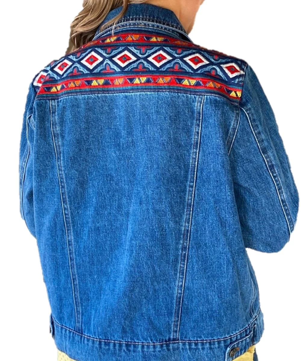 100% Denim; Spread Collar; Long Sleeve; Pewter Snaps; Two Chest Pockets; Two Hand Pockets; Cuffs; Multi Color Embroidery Design On Front And Back; Style #JODIE