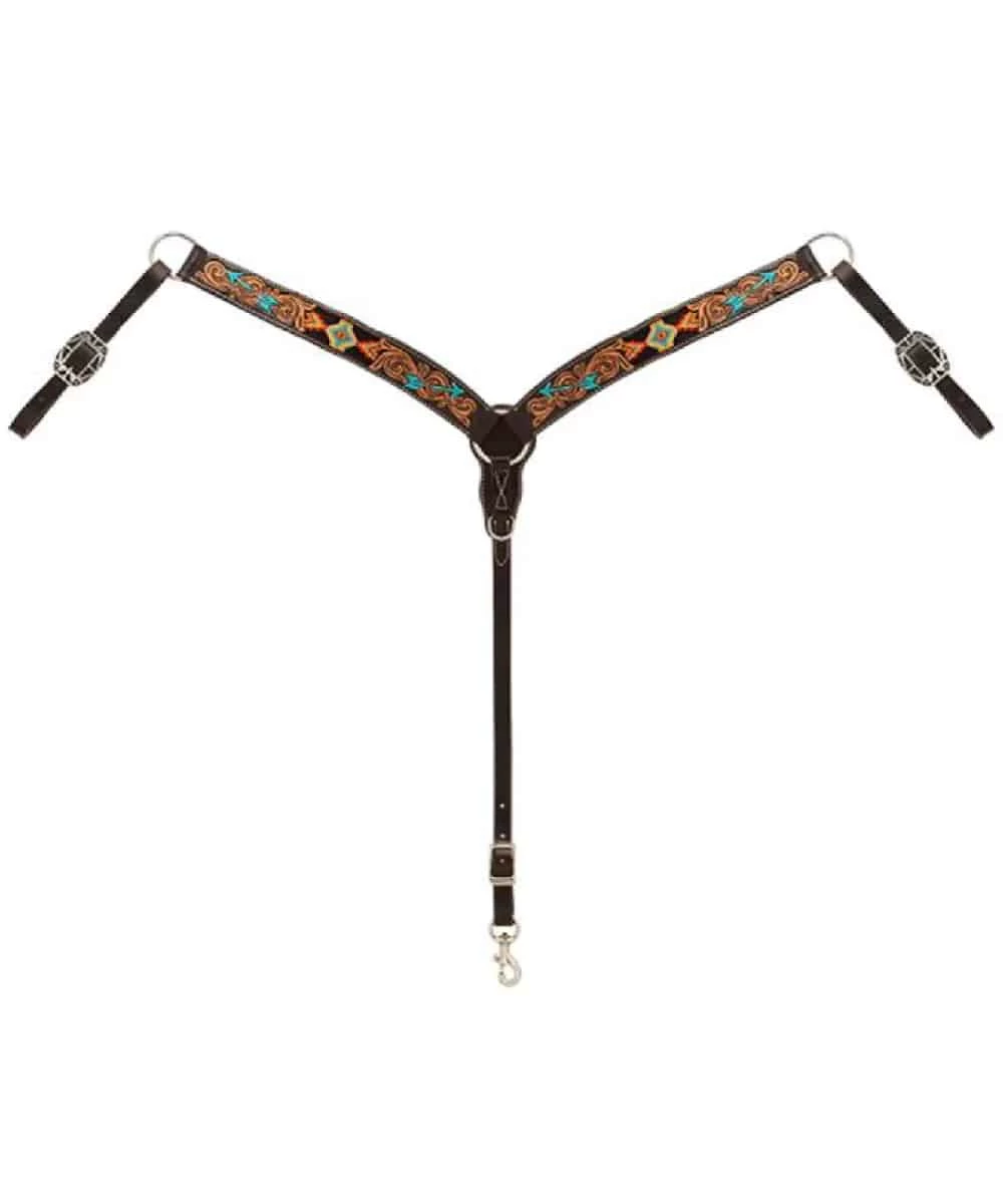 Dark Oiled Leather; Carved Design; Turquoise Hand Painted Arrows; Beaded Inlay; Genuine Cowhide; Non-Rust Stainless Steel Hardware; Designer Buckles; Breast Pieces Taper From 1-3/8″; Pony Size; Style #45100-00-30