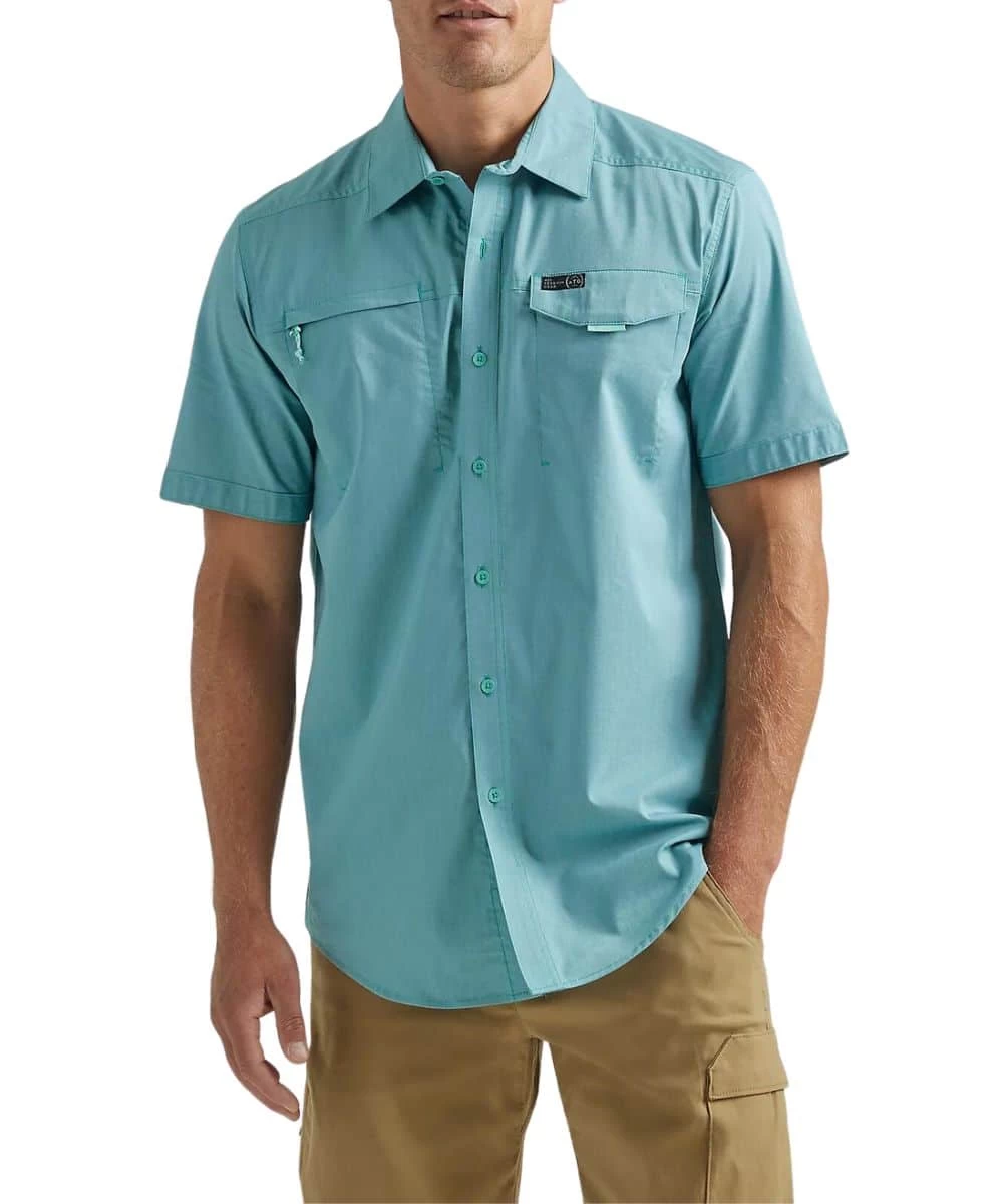 60% Cotton/36% Polyester/4% Spandex; Short Sleeve; Spread Collar; Button Down Placket; Dual Chest Utility Pockets: Left Flap Closure/Right Zip Closure; Welt Vented Back Yoke; Sunglasses Cleaner At Hem; UPF 30; Moisture Wicking; All Terrain Gear; Color: Tidewater; Style #112331236