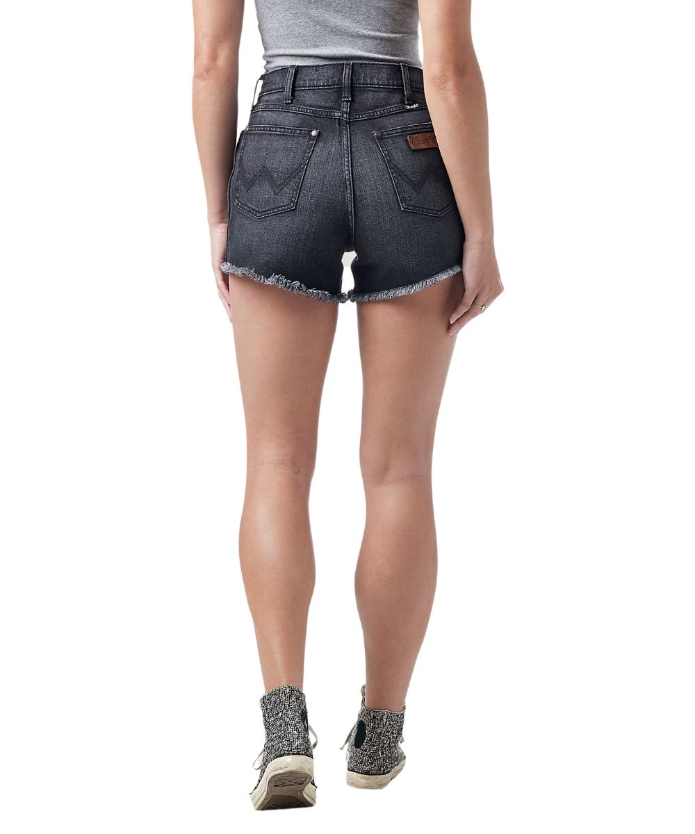 99% Cotton/1% Spandex; Slim Fit; High Rise; Zip Fly With Button Closure; Whiskering; Distressed Detailing; Five Pocket Styling; Logo Stitched Back Pockets; Raw Hem; 3 1/2″ Inseam; Color: Dana/Black Denim; Style #112328559